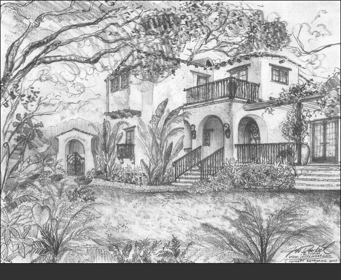 Concept design rendering by Jeff Doubet: Two-Story Spanish-style home and landscape plan on Hot Springs Road in Montecito, CA.